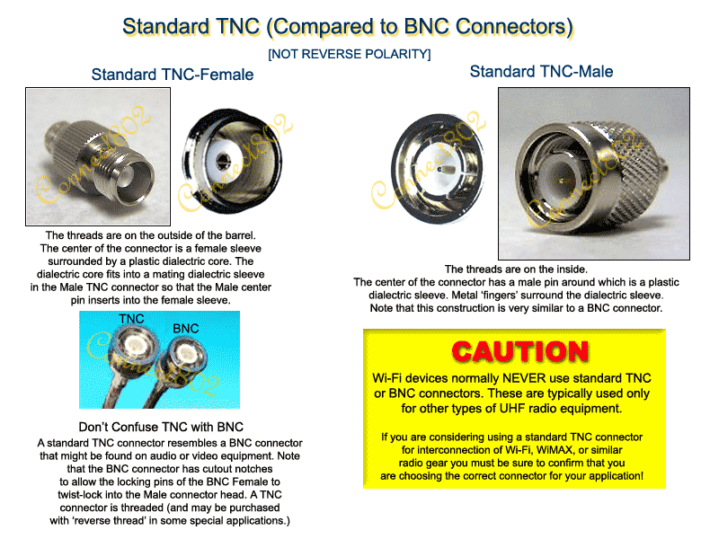 To aid in the selection of antenna cable connectors, Connect802 provides the following connector pictures and descriptions. When ordering custom cables, please carefully study the pictures below to confirm that the cables you order will be the cables you need. Custom cables are not returnable. If you are in doubt, please contact your sales representative with the equipment model number to which you are attaching, and/or photographs of the connectors to which you are mating. (Include a coin or ruler in any photograph as a scale reference). All connectors are assumed to be Standard Thread (right-hand tightening) unless otherwise specified