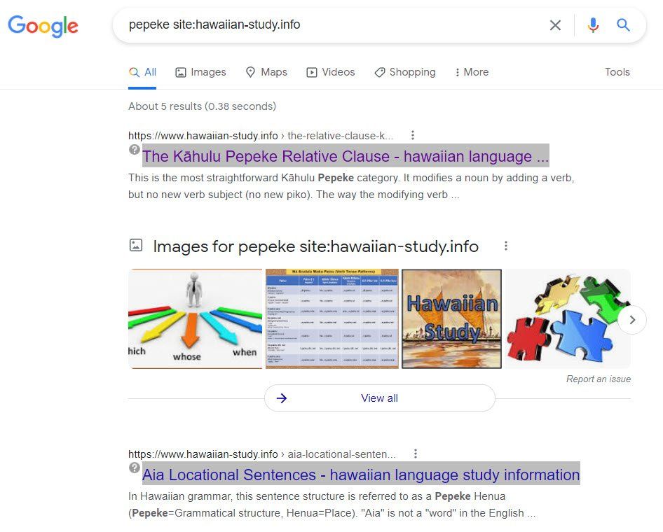 You can search within the Hawaiian Study website by specifying this domain (Hawaiian-Study.Info) as the specific site for your web browser to use. Simply enter the text site:hawaiian-study.info after the search term in your browser's URL bar. You may want to open a new browser window to conduct the search. For example, to search for the word "pepeke" in the website, type: