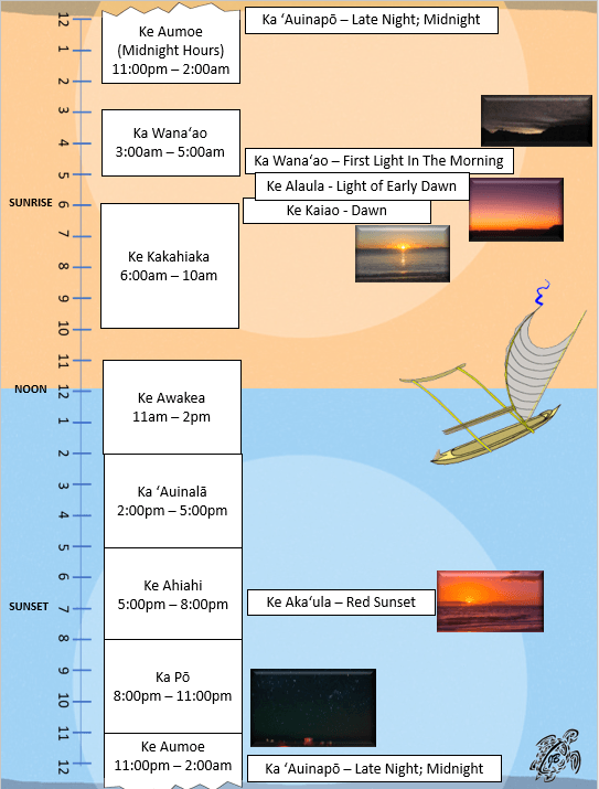 Each day of the 30-day month was named based on the name of the moon phase. There werenʻt "24 hours in a day" but, rather, the day was divided into periods based on the rising and setting of the sun. The words for these periods are shown here: